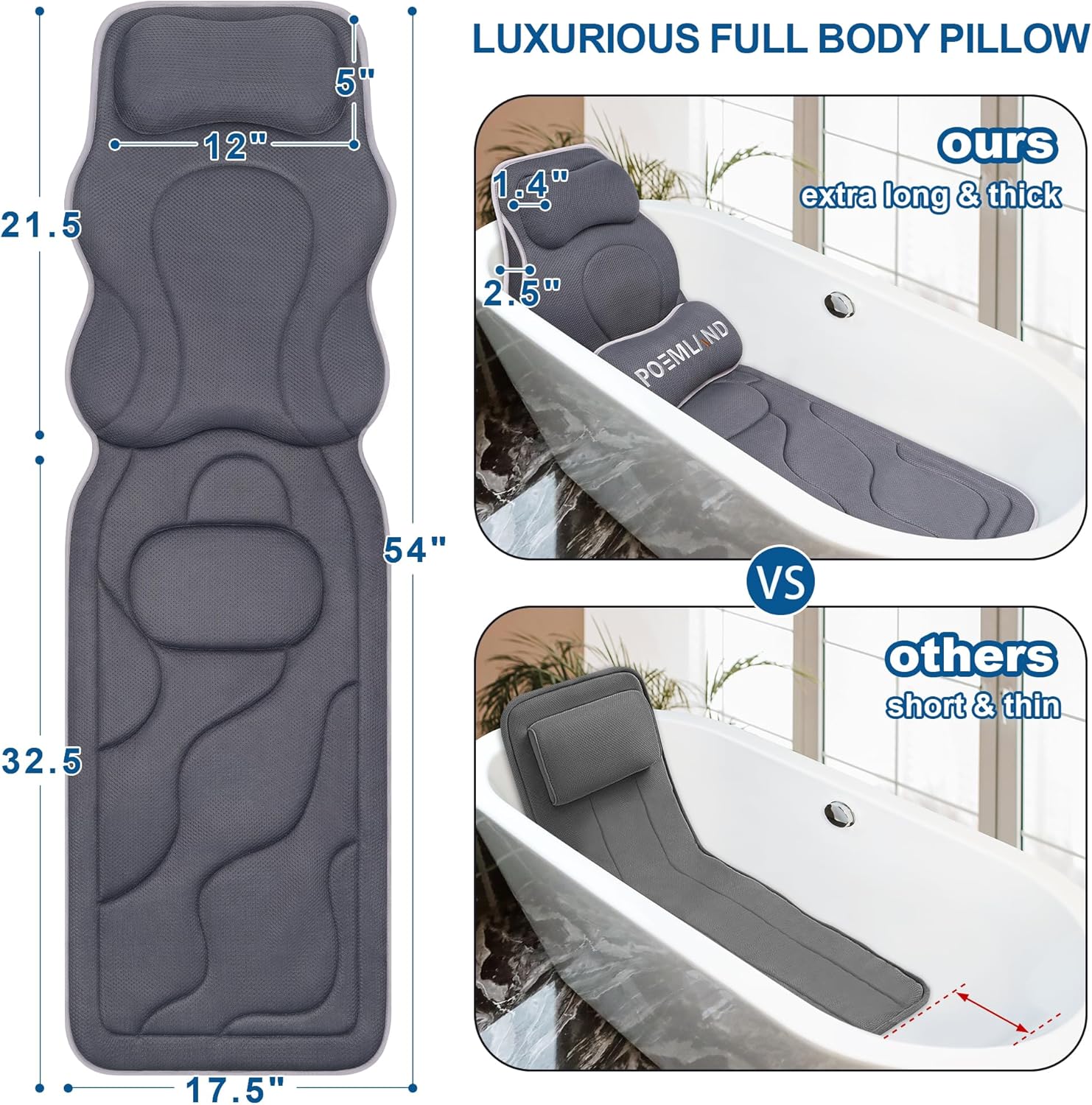 Full Body Bath Pillow for Tub - Extra Long & Thick Tub Pillow with Head, Back & Lumbar Support, 168 Non-Slip Suction Cups, Soft 5D Mesh Spa Cushion, Fits All Tubs-Gift for Soaking(Gray)