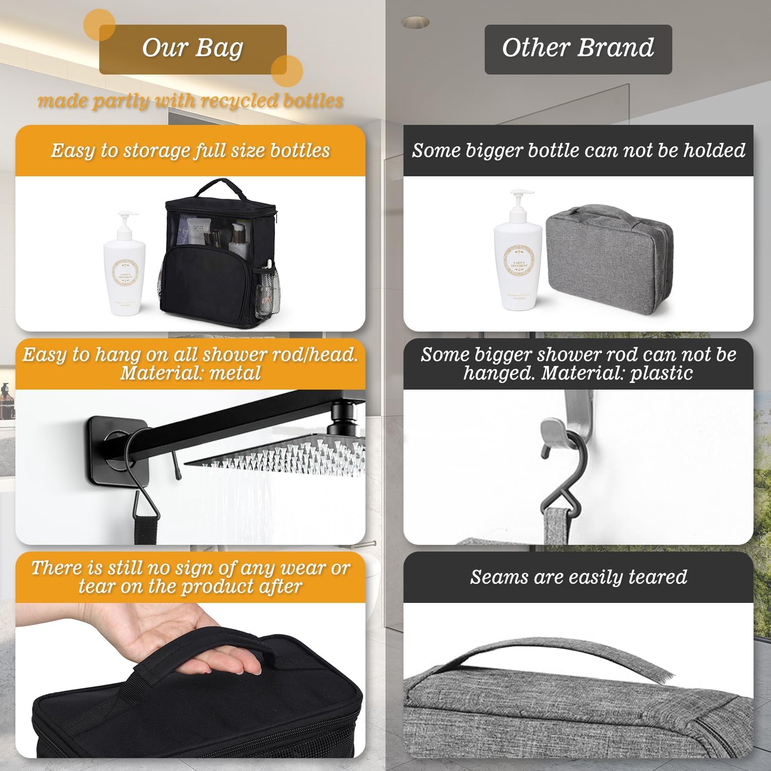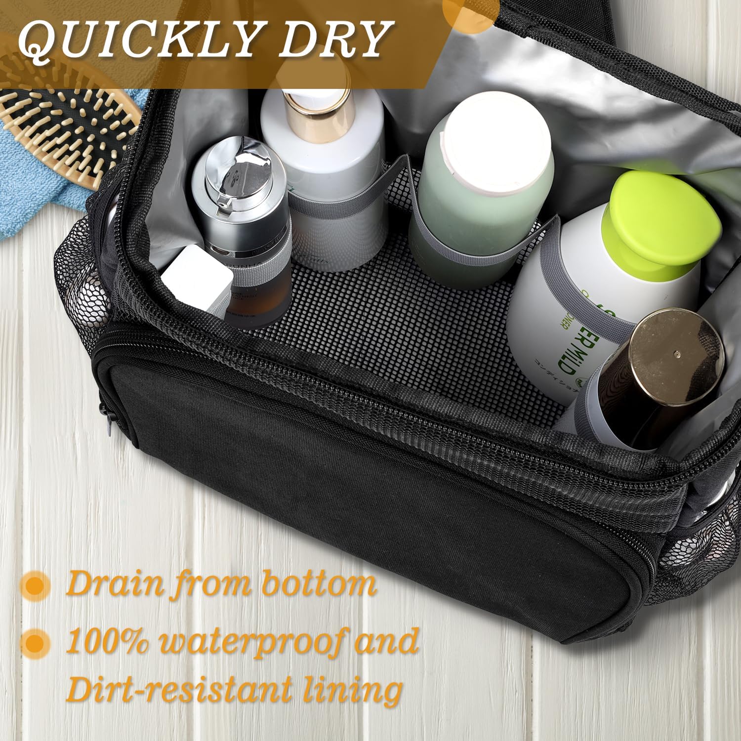 Water Doesn't Stay Inside: The lining is made of PEVA material, which is waterproof and stain resistant. The bottom is a strong mesh, water will drain from the bottom. Special design for ensuring quick-drying and preventing any unwanted odors and rust.