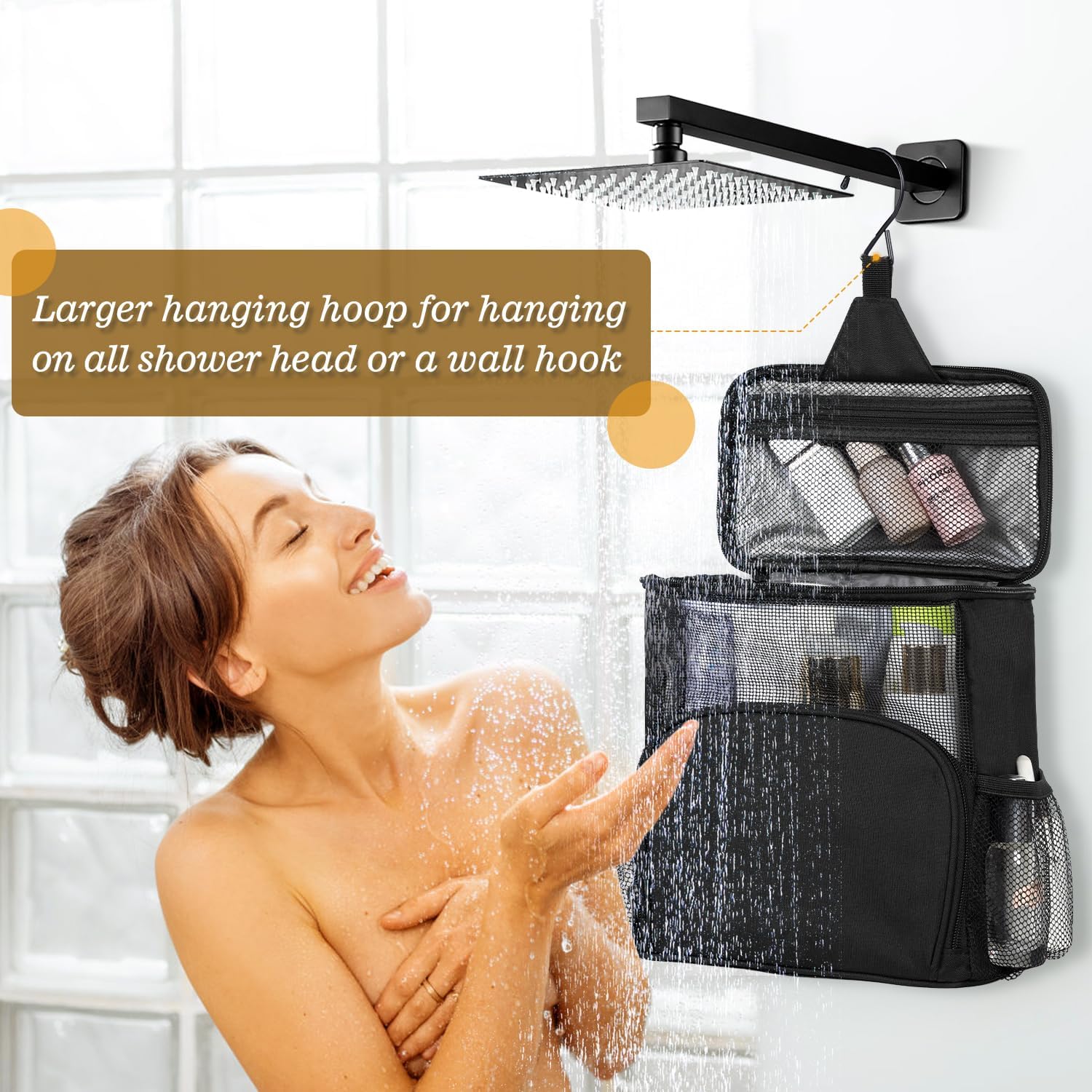 Large Shower Caddy Portable for College Dorm, Hanging Mesh Shower Bag with Hook for Camping Drain from Bottom - Dorm Room Essentials for Guys - Travel Men Women, Black
