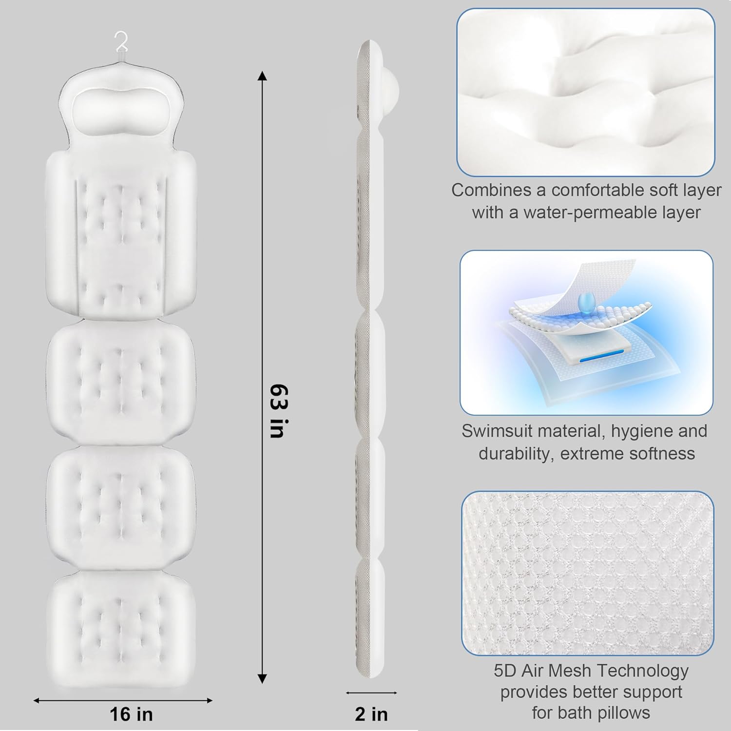 Luxury Full Body Bath Pillow for Bathtub, Bath Pillows for Tub with Mesh Laundry Bag, Cushion for Bathtub Headrest Neck Back Support - 5D Air Mesh & Quick Drying | White 63" x 16"