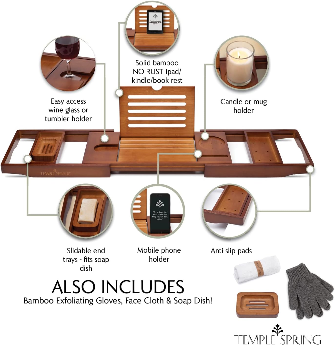 Temple Spring Wooden Bathtub Tray, Bamboo Bathroom Accessories, Bath Tray for Tub, at Home Spa Essentials, Board for Tub Table, Bath Caddy for Bathtub Accessories & Bathroom Essentials – Wood Brown
